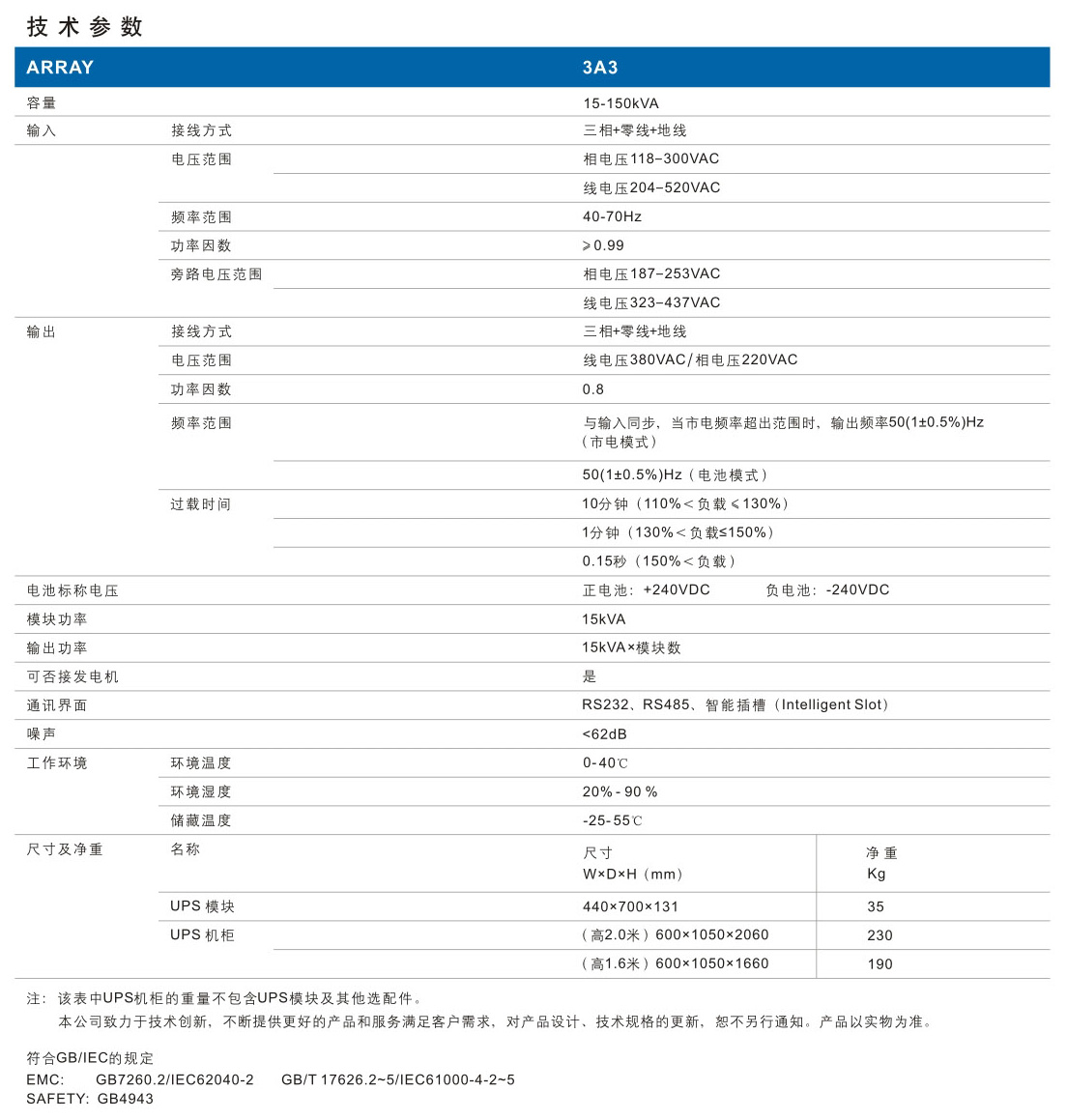 是新型的三進三出UPS採用全數字化控制技術,集中瞭(le)當今電力電子和自動控制領域最先進的技術成果,是UPS行業技術革命的一塊裏程碑。ARRAY 3A3的誕生給用電設備的供電方案帶來瞭(le)新的理念,使得用電設備的可用性得到突破性的提高。ARRAY 3A3採用抽屜式高智能模塊化設計具有易插拔功能,不僅可以通過增減機櫃内的模塊來滿足功率輸出及可靠性要求,隻要冗餘允許還可以在線進行維護,實現零停機檢修時間。ARRAY 3A3採用無線並(bìng)聯技術,降低瞭(le)單點故障的概率,可靠性的設計臻於完美。ARRAY 3A3採用人性化的簡易操作設計以及完備的遠程監控功能,使用者可以簡單明瞭(le)地操作管理UPS。ARRAY 3A3具備優異的電氣性能能爲各種負載提供安全有效的電源保障。