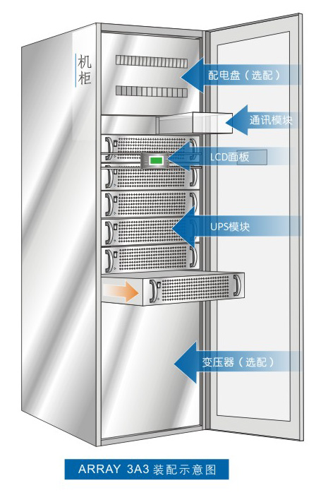 ARRAY 3A3採(cǎi)用全模塊化設計並(bìng)擁有易插拔功能整個UPS供電系統由UPS模塊通訊模塊配電盤以及部分選裝件再加上機櫃組成、每個UPS模塊均爲台功能完備的15KVA UPS通過先進的無線並(bìng)聯控制技術及巧妙的通訊協調方法,UPS模塊及通訊模塊可實現在線更換而不影響其它部分的正常工作、新加人的模塊不需要任何校準動作就可以加入系統擴容和維護都非常方便。