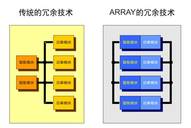 ARRAY 3A3系統級的N+X並(bìng)聯冗餘可大幅提高整個UPS供電系統的可靠性、並(bìng)且,由於採用7當今業界領先的無線並(bìng)聯控制技術、相比於有線並(bìng)聯減少瞭(le)單點故障點(穩态工作時即使並(bìng)聯通信線故障也能正常工作)、把可靠性又提升到一個新的高度。